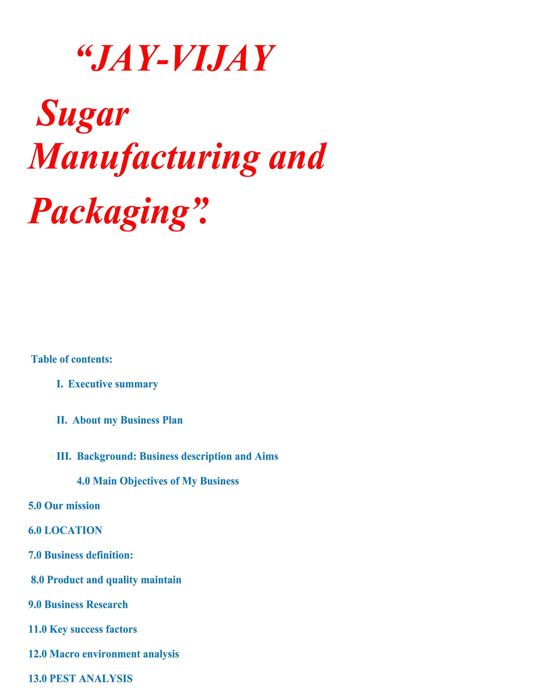 This document is a business plan for a proposed sugar manufacturing and packaging company called "Jay-Vijay" in Sholapur, India. The plan discusses objectives to produce high quality sugar and become a leader in the market. It outlines the production process, products, capacity, and compliance with relevant government regulations regarding licensing, pricing of sugarcane and sugar, distribution channels, packaging, and more. Market research findings on the sugar industry are also presented.