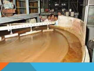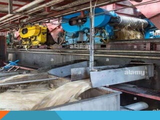 This document provides information about the sugar industry in Pakistan. It discusses the history of sugar mills in Pakistan, the importance of the sugar industry, the manufacturing process of sugar including cane preparation, juice extraction, purification and crystallization. It also discusses factors affecting sugar production such as fertilizers and burning cane, and ways to improve sugar production such as utilizing byproducts, using organic fertilizers, paying farmers higher prices, and adopting green technologies.