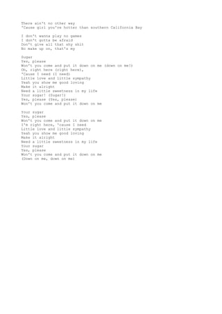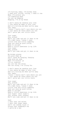 The singer expresses their longing for their lover's affection and intimacy. They feel broken, insecure, and weak without their lover, begging for their "loving" and pleading to be "deep in [their] love." The singer desires their lover's "sugar," or affection, to make them feel better and give them sweetness in their life. They want their lover to come be with them.