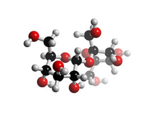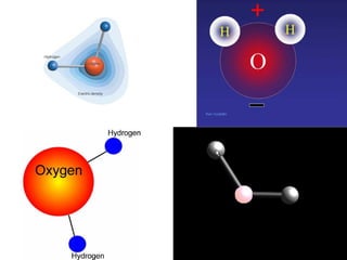 The document discusses the composition of water, carbon dioxide, and sugar molecules. Water molecules are made up of two hydrogen atoms and one oxygen atom. Carbon dioxide molecules are made up of one carbon atom and two oxygen atoms. Sugar molecules are made up of carbon, hydrogen and oxygen atoms arranged as C6H12O6. The sugar molecules use water and carbon dioxide molecules during photosynthesis and release oxygen into the air.