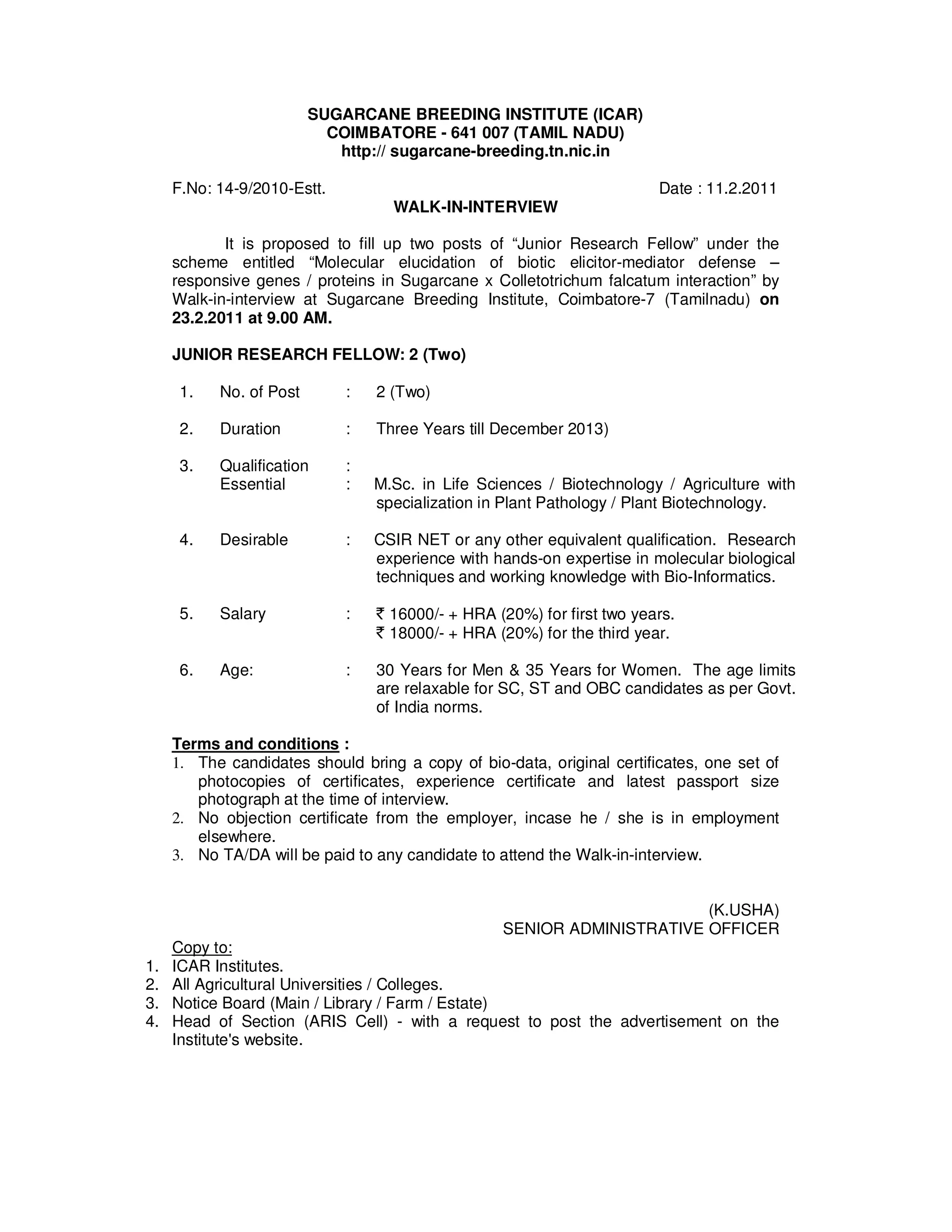 The Sugarcane Breeding Institute in Coimbatore, Tamil Nadu is holding a walk-in interview on February 23, 2011 to fill two positions for Junior Research Fellow under a scheme studying molecular defense responses in sugarcane against Colletotrichum falcatum. Candidates with an M.Sc. in life sciences, biotechnology or agriculture specializing in plant pathology or biotechnology are eligible. Experience with molecular techniques and bioinformatics is desirable. The position offers a salary of Rs. 16,000-18,000 per month plus HRA depending on years of experience.