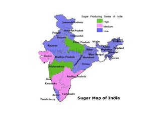 India is the second largest producer of sugarcane in the world after Brazil. Sugarcane is grown on around 4 million hectares of land in India and produces around 70 tonnes per hectare. India is also a major producer of traditional cane sugar products like gur and khandsari. Sugarcane is used to produce various products like sugar, gur, molasses, bagasse which have applications in food, fuel, paper industries. However, sugarcane cultivation also faces issues like water scarcity, inefficient production methods and transport delays. New sustainable farming techniques and the use of sugarcane for ethanol production can help address these challenges.
