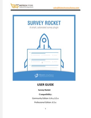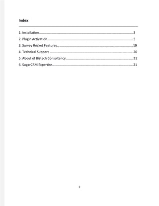 This document provides a 22 step user guide for the Survey Rocket plugin for SugarCRM. It outlines the installation process and describes the key features available in the plugin such as creating survey templates, sending surveys to recipients, viewing survey responses and reports. Technical support for the plugin is available from the plugin developer, Biztech Consultancy.