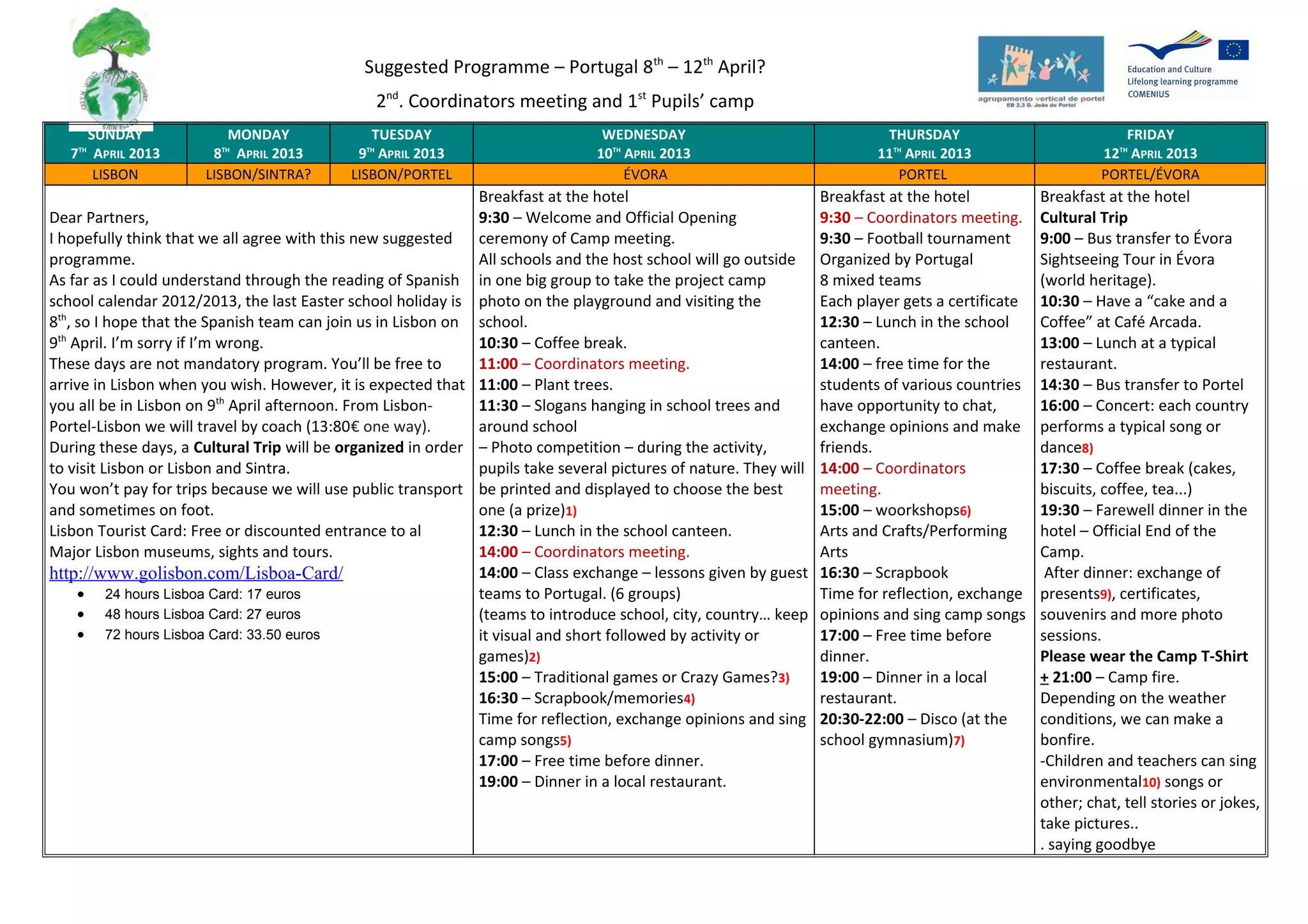 The document outlines a suggested itinerary and program for an international student camp to be held in Portugal from April 8-12, 2013. The schedule includes coordinators meetings, cultural activities in Lisbon and Sintra, workshops, sports tournaments, traditional performances from each country, and evening social events like discos. On the final night there will be a farewell dinner, concert of typical songs from each country, exchange of gifts, campfire, and goodbye messages. Logistical details are provided about transportation and tourist cards, and participating schools are asked to clarify any dietary restrictions or responsibilities they have regarding planned activities.