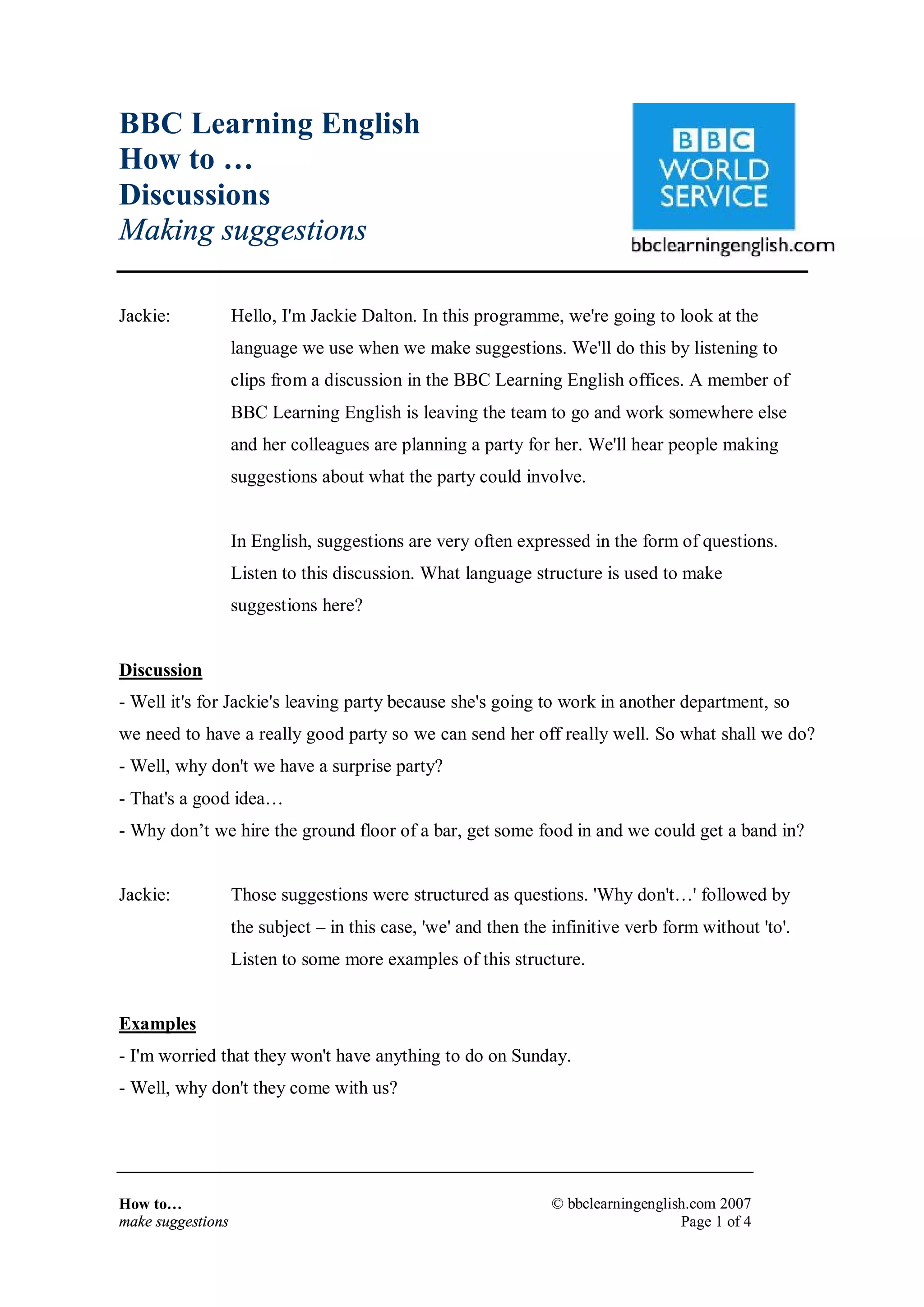 The document discusses how to make suggestions in English. It examines language structures used such as question forms with "why don't/doesn't" followed by a subject and verb, as well as "shall we" and "why not" followed by a verb. It also looks at using "let's" to motivate people and suggestions with "could" or "should" followed by a verb. Examples of suggestions are provided covering a range of polite and direct language structures.
