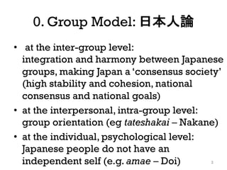 This document summarizes different models that have been used to analyze Japanese society and culture. It discusses the group model which views Japan as homogeneous and consensus-driven. It then introduces the multicultural model which sees Japan as heterogeneous with many subcultures. It also notes how analyses of Japan have changed over time from seeing it as unique to being more critical. The document also discusses debates around convergence theory and cultural imperialism in sociology. Finally, it emphasizes the complexity of Japanese society and importance of understanding both overt and covert aspects using concepts like "double codes."