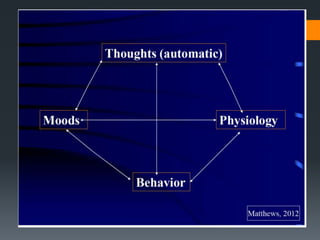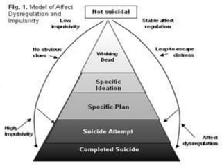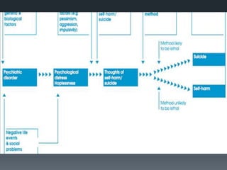 Suicidal patients develop a crisis when they view problems as unsolvable and suicide as the only solution. They feel hopelessness about enduring or solving difficulties and see suicide as relief. Those at higher risk have schemas involving vulnerability and a belief that others are rejecting or have high expectations. It is important to comprehensively assess recent stressors, diagnoses, and feelings of hopelessness. Treatment includes crisis intervention with a focus on identifying high-risk individuals and hospitalization when needed, as well as continuing therapy viewing suicidal behavior as a problem-solving style. Ongoing assessment of suicide risk is crucial.