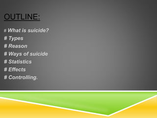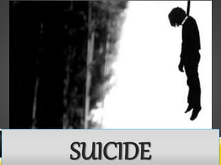 This document defines and discusses suicide. It outlines types of suicide, common reasons for suicide such as poverty, unemployment and depression. It discusses common methods like poisoning, hanging and firearms. Statistics provided indicate about 28 people commit suicide each day in Bangladesh, with higher rates among young unmarried people in towns. The effects of suicide and ways to help control it are also examined, such as improving mental healthcare and education to prevent suicide.