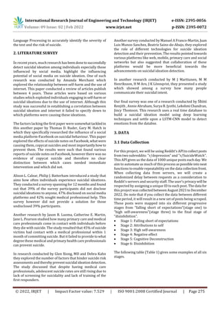 This document describes a study that uses machine learning classifiers to analyze reddit data and detect suicidal ideation for prevention. Data was collected from the r/depression and r/SuicideWatch subreddits over several months in 2021-2022. Functions were created to automate the data collection process. The data was classified into six stages relating to suicidal severity. TF-IDF and CNN models were trained on the reddit data, with the TF-IDF model achieving an AUC score of 92% and F1-Score of 96% for identifying suicidal ideation.