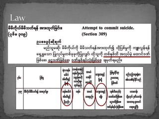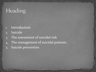 This document discusses suicide and its prevention. It provides information on risk factors for suicide like mental illness, past attempts, and life stressors. Common warning signs and methods are outlined. The assessment and management of suicidal patients is also described, including treatment, observation in hospitals, and ensuring community support after discharge. Suicide prevention strategies discussed include restricting access to lethal means, educating the public, and improving mental healthcare.