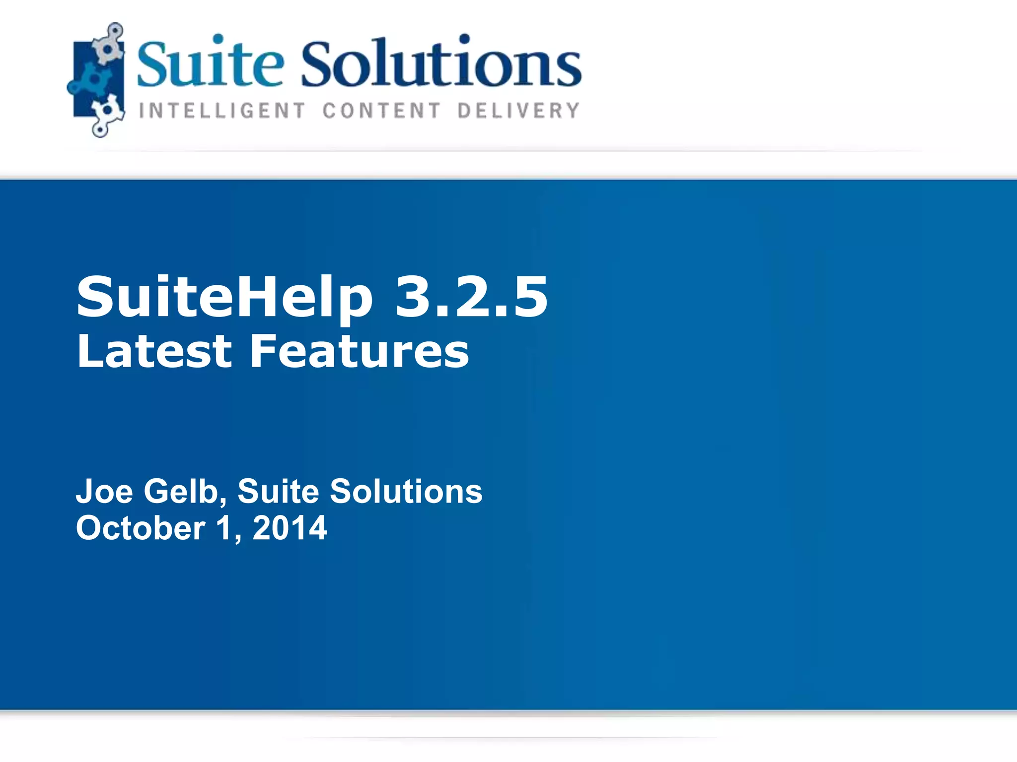 SuiteHelp 3.2.5, developed by Suite Solutions, provides an industry-strength solution for HTML-based content delivery, focusing on quick, reliable, and secure access to information. Key features include improved HTML5 compliance, advanced search capabilities, and enhanced video support, along with upcoming releases that promise responsive design and better client-based search. The platform supports various deployment options and aims to cater to cross-industry needs, ensuring high customization and branding opportunities.