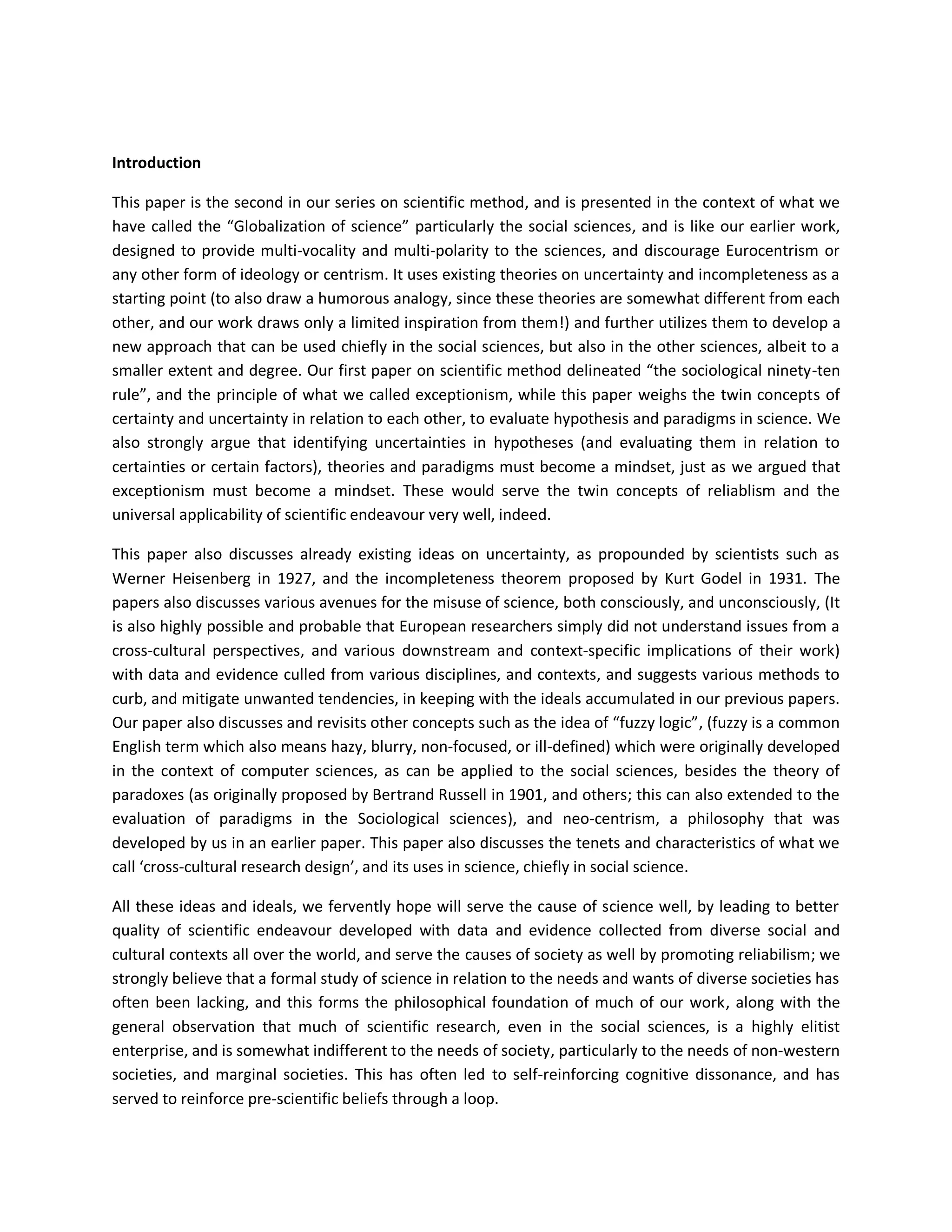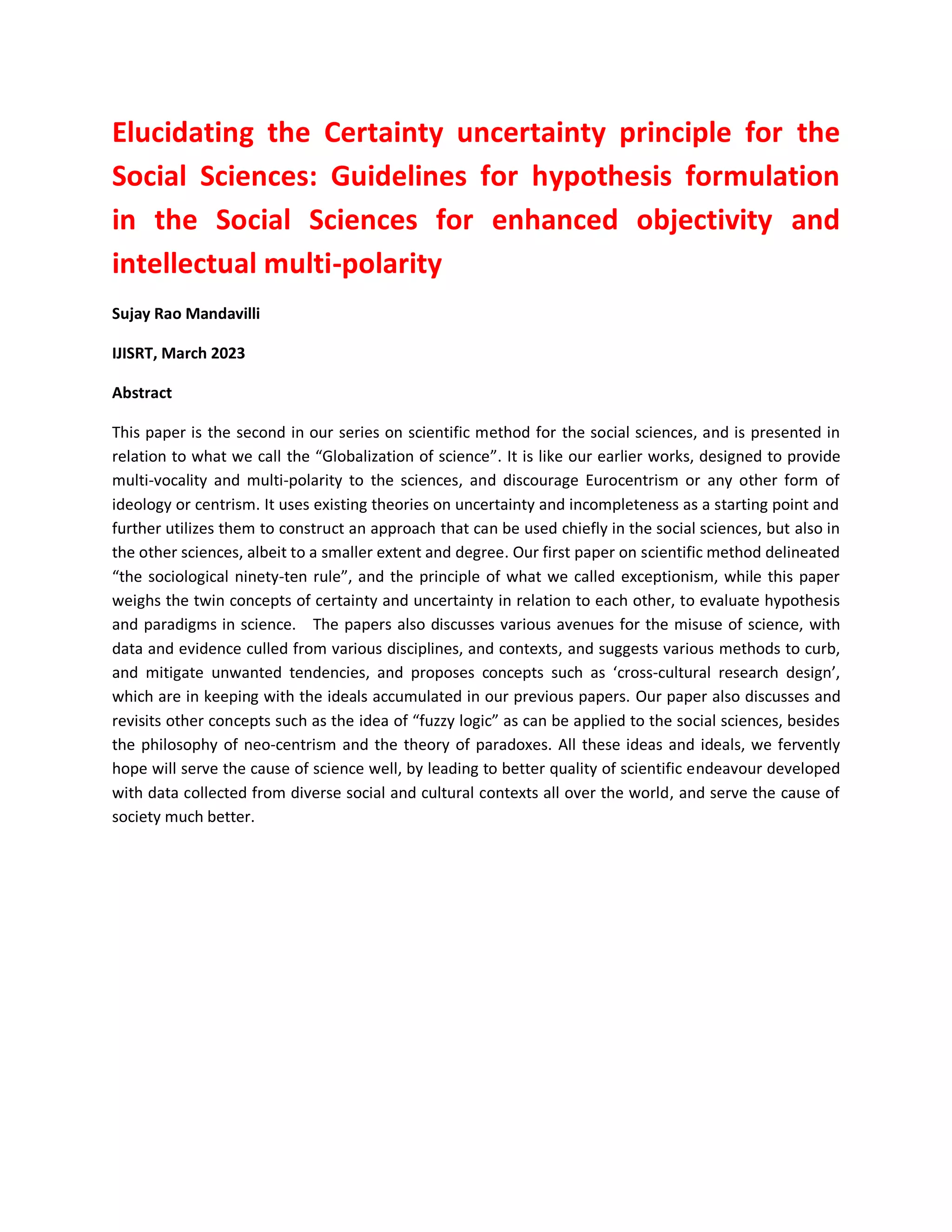 This document discusses guidelines for formulating hypotheses in the social sciences that consider both certainty and uncertainty. It proposes weighing certainty and uncertainty when evaluating hypotheses to make science more objective and multi-polar. The document reviews theories of uncertainty from physics and mathematics and discusses how concepts like fuzzy logic, paradoxes, and cross-cultural research can be applied to social sciences. The goal is to make scientific research more inclusive of diverse contexts and needs of societies to better serve social progress.
