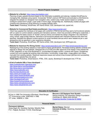 Sujay Das is a UI designer and developer with over 15 years of experience in website design and development, specializing in creating responsive and visually appealing websites. He has a strong background in various technical skills, project management, and team leadership, demonstrated through roles in multiple companies where he has successfully managed projects and improved client websites. His educational background includes a B.Com degree and a certification in UX design from the Interaction Design Foundation.