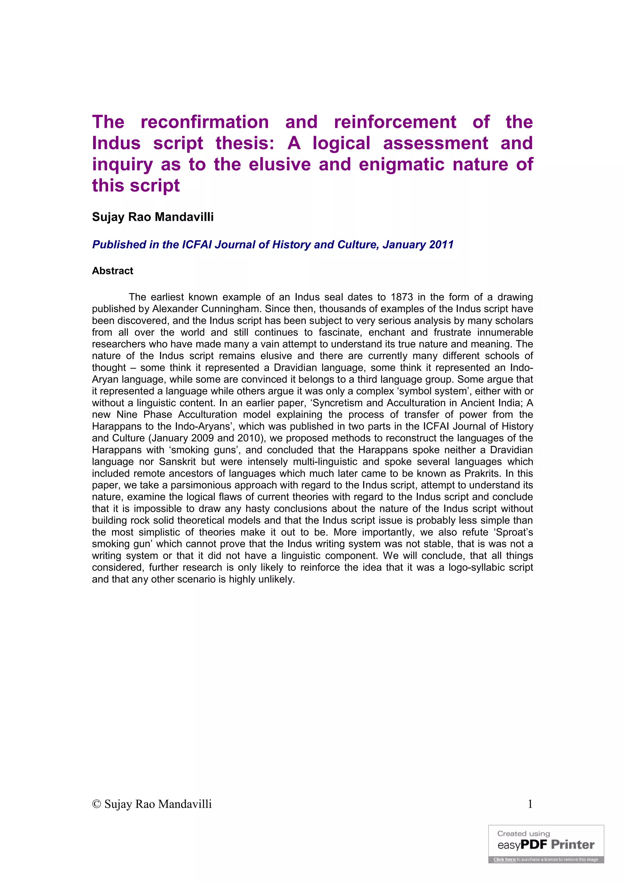 The document discusses theories about the nature and origins of the Indus script. It argues that: