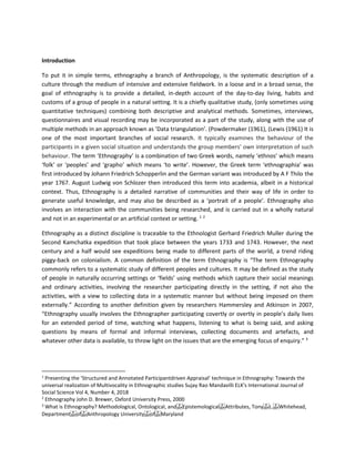 Long-term ethnography aims to study cultures over extended periods of time through repeated fieldwork. This allows researchers to document changes within cultures and understand how circumstances influence cultural evolution. Prior ethnographic studies have typically only provided a single perspective; long-term ethnography allows obtaining secondary opinions to address biases, anomalies, or neglected areas from the first study. The objectives of long-term ethnography are to analyze cultural changes over time, study the impacts of internal and external influences, and provide alternative viewpoints through diverse research teams or methodologies.