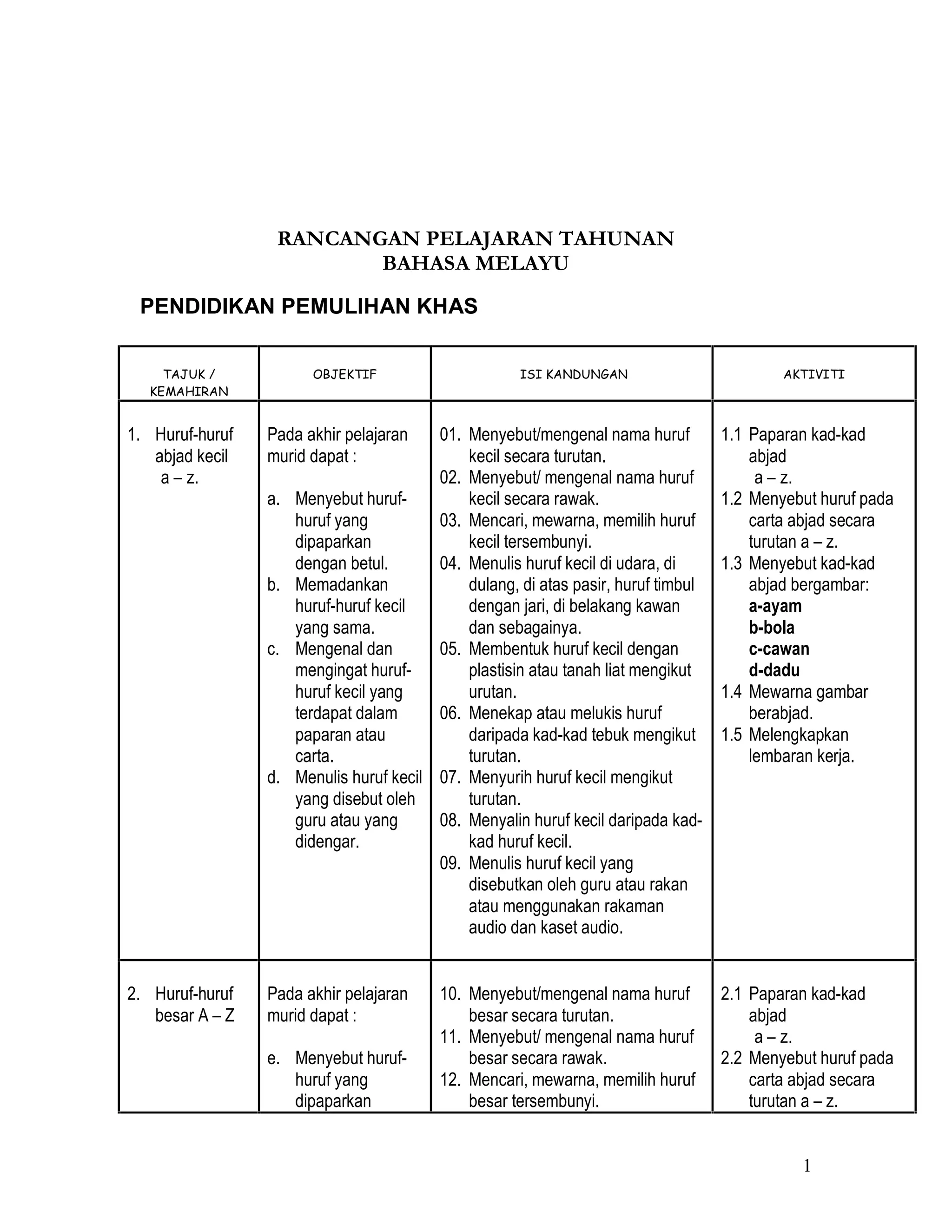 Rangkaian pelajaran tahunan bahasa Melayu untuk pendidikan pemulihan khas ini memberi tumpuan kepada 8 kemahiran asas bahasa termasuk mengenal huruf, suku kata, dan perkataan. Murid diharap dapat mengenal, membaca, dan menulis unsur-unsur bahasa tersebut berdasarkan gambar atau kad yang dipaparkan melalui berbagai aktiviti seperti mewarna, melengkapkan ayat, dan bermain permainan.