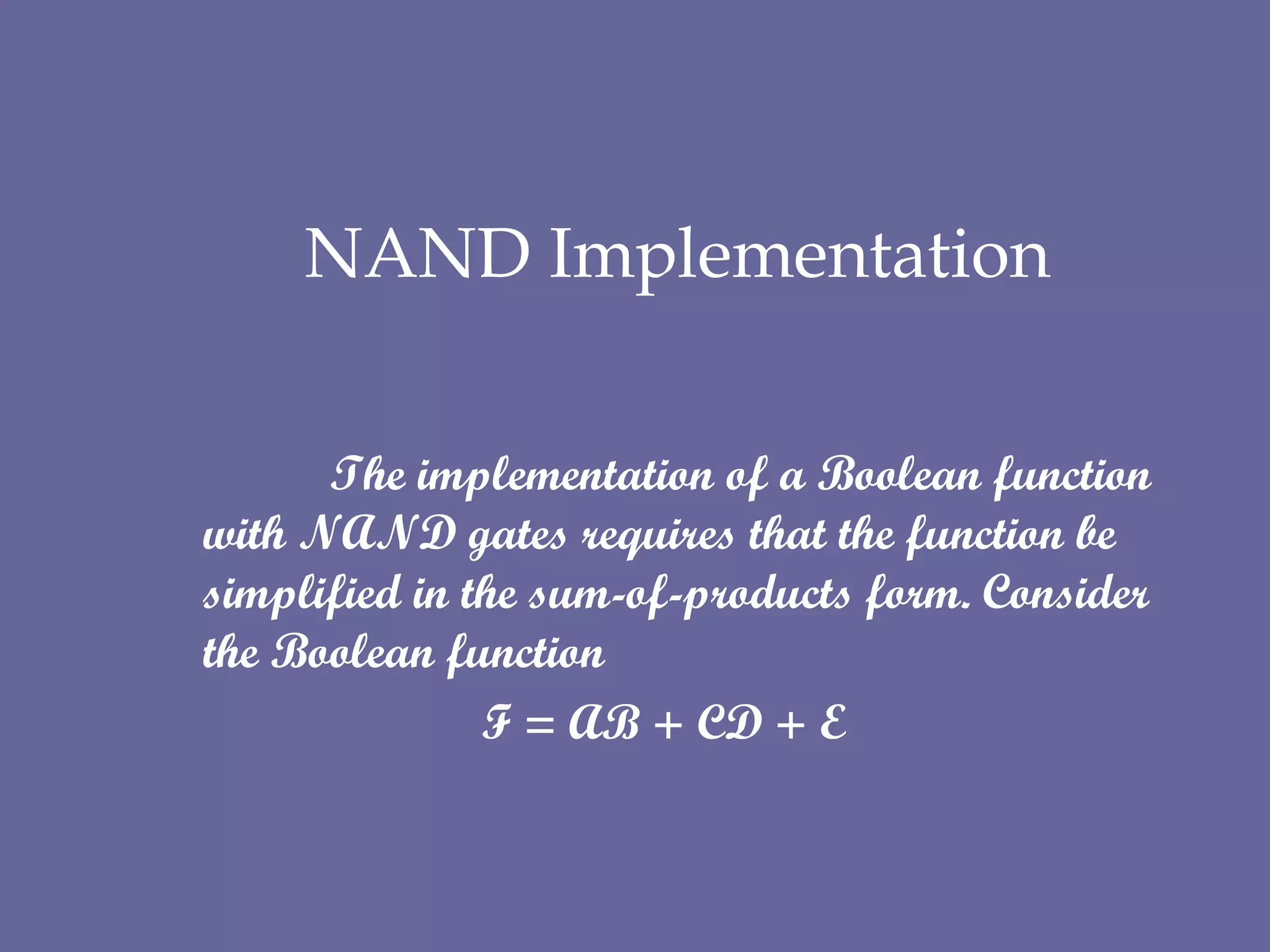 The document discusses different implementations of Boolean functions including NAND, AND-OR-INVERT, and NOR. It provides examples of converting binary numbers to decimal, hexadecimal, and octal representations.