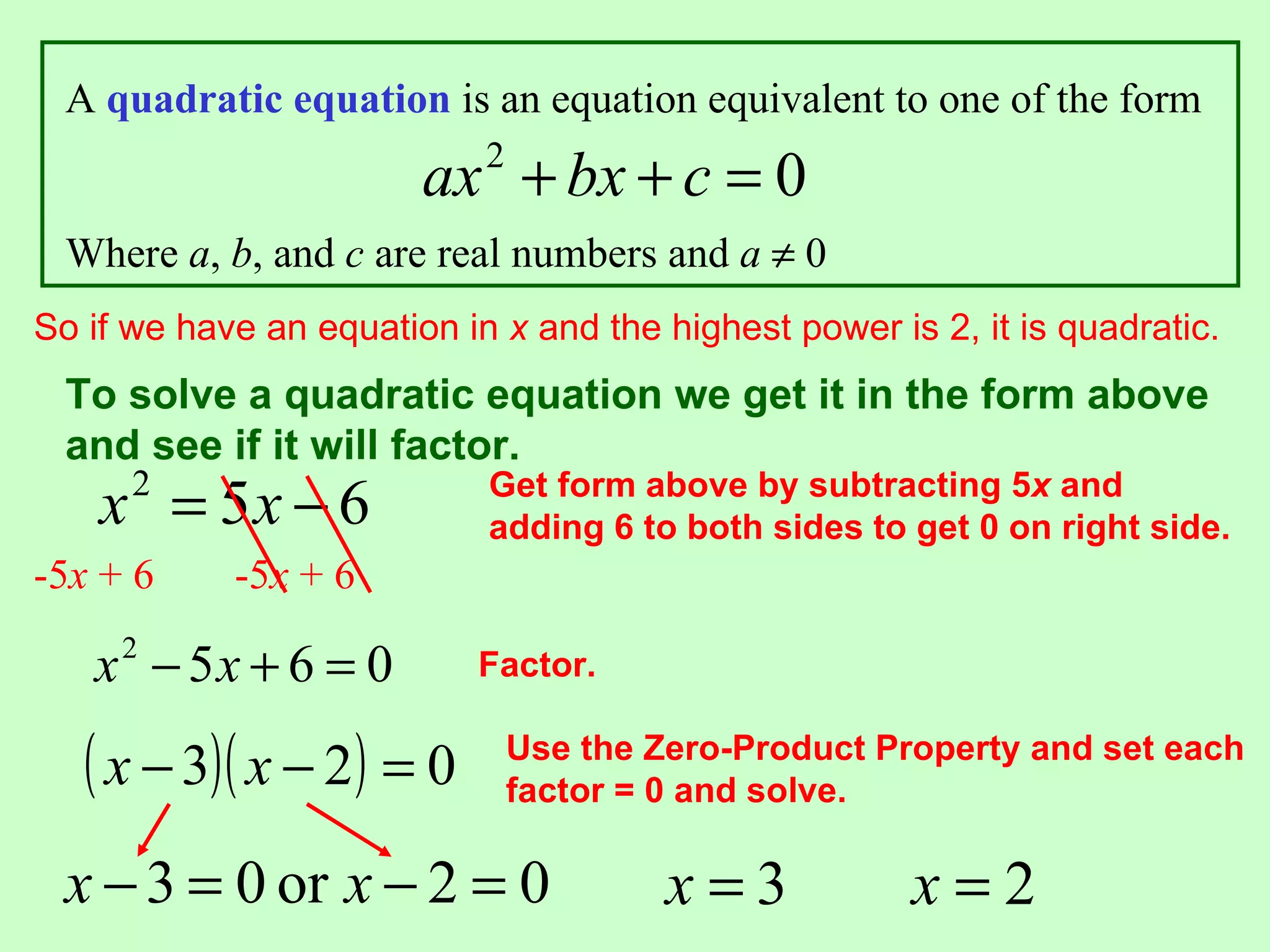 A quadratic equation is an equation equivalent to the form ax^2 + bx + c = 0, where a, b, and c are real numbers and a ≠ 0. To solve a quadratic equation, we first get it into standard form and then either factor if possible or use the quadratic formula. If factoring results in a negative number under a square root, there are no real solutions. Completing the square is another method that allows us to factor a quadratic expression and solve for the roots.