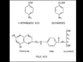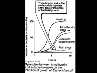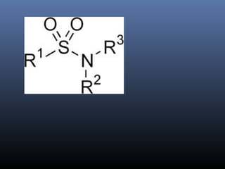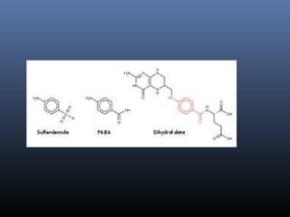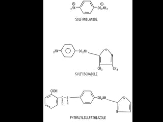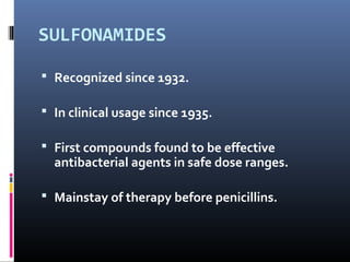 Sulfonamides were the first effective antibacterial agents discovered in the 1930s and were widely used before the development of penicillin. While now largely replaced by other antibiotics, they continue to have therapeutic uses. Key points include: sulfonamides work by inhibiting folic acid biosynthesis; they are excreted renally so dosage should be adjusted for renal impairment; and trimethoprim-sulfamethoxazole is a commonly used combination that is synergistic and has expanded antimicrobial activity. Adverse effects can include allergic reactions and hematological effects like anemia.