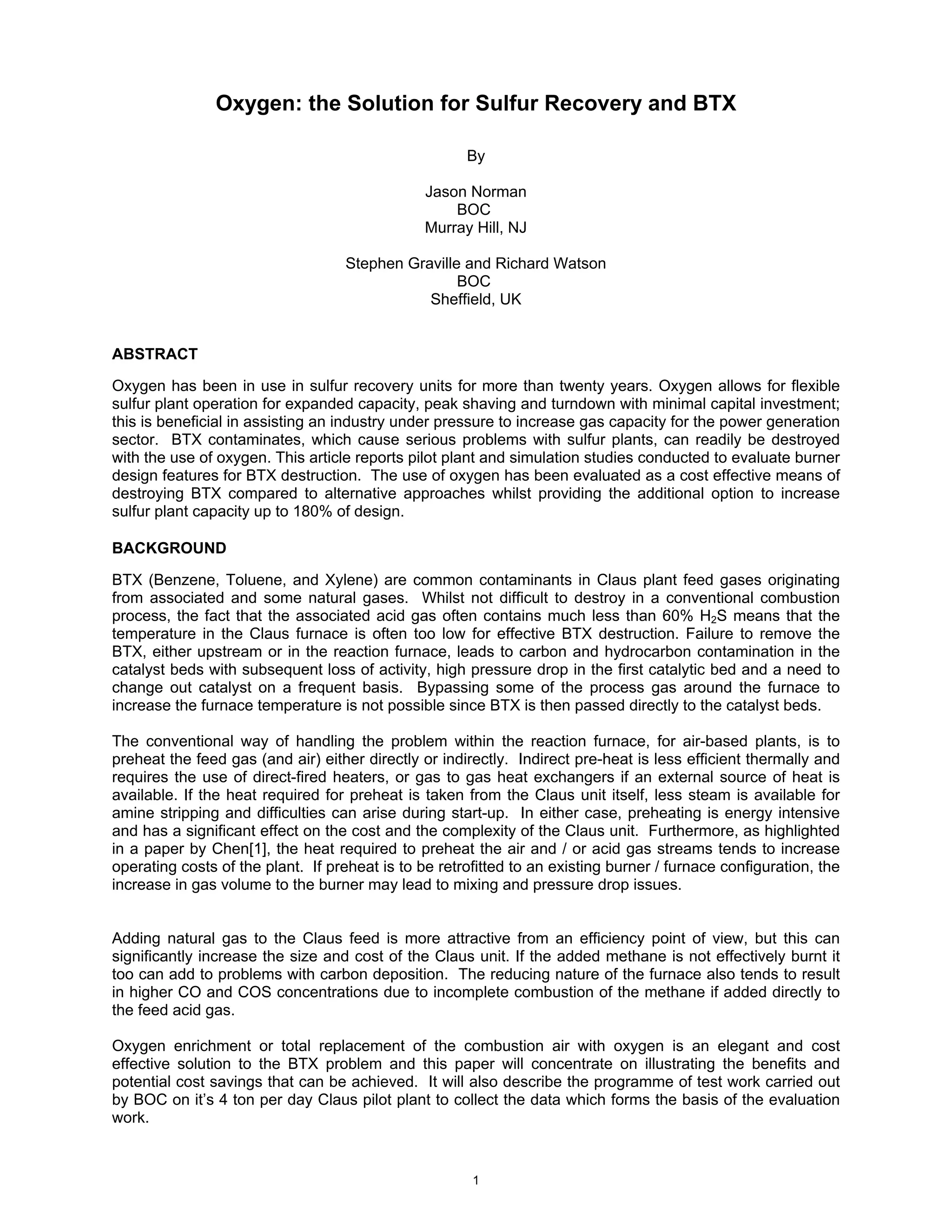 The document discusses the use of oxygen for sulfur recovery and BTX (benzene, toluene, xylene) destruction in Claus plants, highlighting its advantages for flexible operation and increased capacity with minimal capital investment. The study reviews pilot plant and simulation research on burner designs that effectively eliminate BTX contaminants while optimizing combustion processes, demonstrating significant potential cost savings. BOC's technology advancements, including a kinetic computational fluid dynamics model, enable better understanding and management of reactions in sulfur recovery operations.