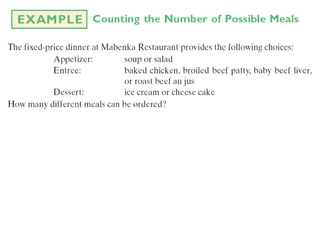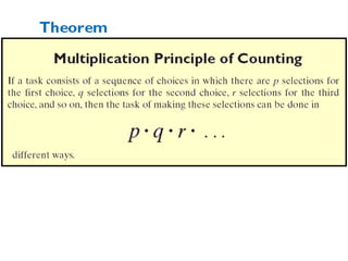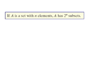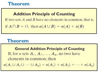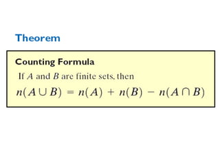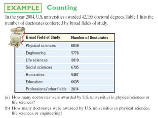 The document discusses three counting objectives: 1) Listing all subsets of the set {1,2,3}, 2) Determining the number of students in a survey of 200 that had been to Florida or New York or neither, and 3) Calculating the number of possible three-symbol code words where the first symbol is an uppercase letter, second is a digit, and third is a lowercase letter.