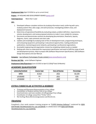 The document outlines the objective, experience, skills, and qualifications of an individual seeking employment. Specifically, it summarizes 1+ years of experience in ASP.NET development including payment gateway integration. Areas of expertise include Microsoft technologies, programming languages, and SQL Server. The individual holds a B.Tech degree and seeks a competitive role to grow professionally.
