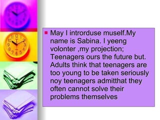 The document discusses teenagers' rights and challenges. It introduces the speaker, Sabina, a teenage volunteer. It notes that while adults see teenagers as too young, teenagers admit they often cannot solve their own problems. The document also mentions that society blames teenagers for issues like violence and drugs, but experts argue societal changes force teenagers to find their own lifestyle. It suggests being true to oneself and not worrying about faults. The document lists some children's rights like name, privacy, health care, and leisure. It advocates for the right to choose one's family.