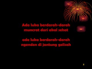 Dokumen ini menggambarkan pengalaman emosional yang dalam melalui berbagai metafora tentang luka. Ada penekanan pada rasa sakit yang muncul dari akal sehat dan hati yang gelisah. Penulis juga menyinggung tentang pengabaian dan pencarian identitas dalam kesedihan.
