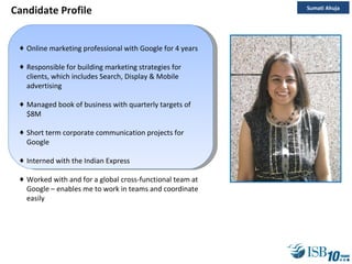 Sumati Ahuja is applying for the position of Director of the Marketing Coordination Committee at the Indian School of Business. She has 4 years of experience in online marketing at Google, where she built marketing strategies and managed a $8M book of business. If selected, she aims to focus on five key areas: improving knowledge sharing, revamping ISB merchandise, boosting alumni outreach, promoting diversity and achievements of ISB students, and strengthening online branding of the school. For online branding, she proposes enhancing ISB's website and social media presence to highlight faculty, alumni and student accomplishments in order to better promote the school.