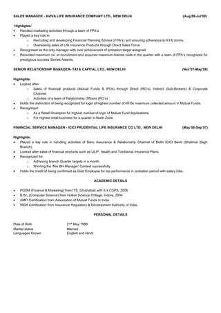 Sumeet Sharma has over 8 years of experience in branch management, sales, marketing, and customer service for e-commerce and financial organizations. He held roles such as Branch Manager at Indiamart Intermesh Ltd. and Sales Manager at Max New York Life Insurance and Aviva Life Insurance. He has a strong track record of exceeding sales targets and leading high-performing teams. Sumeet has an MBA in finance and marketing and professional certifications in mutual funds and insurance.