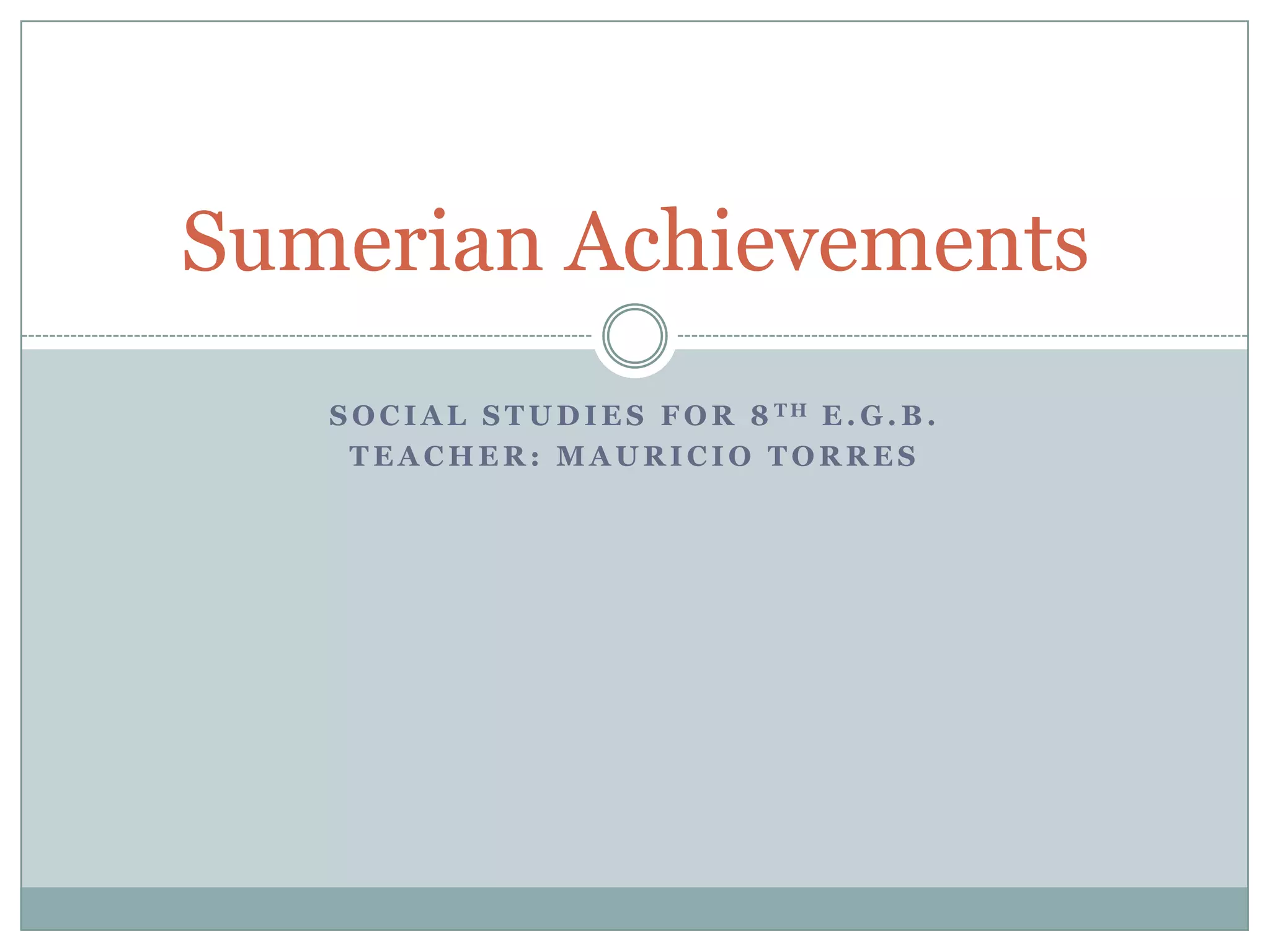 The Sumerians developed many important achievements including the first writing system called cuneiform using pictographs and syllables on clay tablets. They also invented the wheel for vehicles and pottery, as well as advances in math based on the number 60, architecture like ziggurats, and arts including sculpture, jewelry, and cylinder seals.