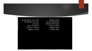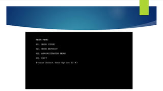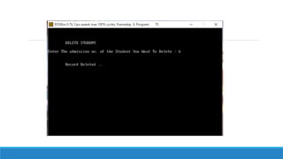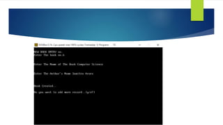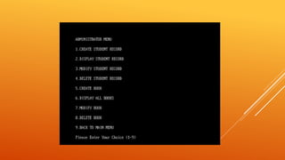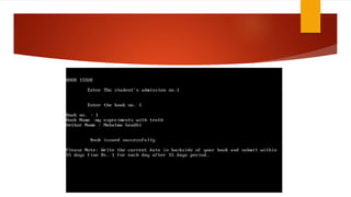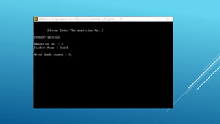 This document contains the source code for a C++ library management system project. It includes classes for books and students, along with functions for creating, modifying, deleting records, issuing and returning books. The main function displays menus for book operations, administrator options, and exits the program. The project uses file handling to read from and write to data files to store book and student records long term.