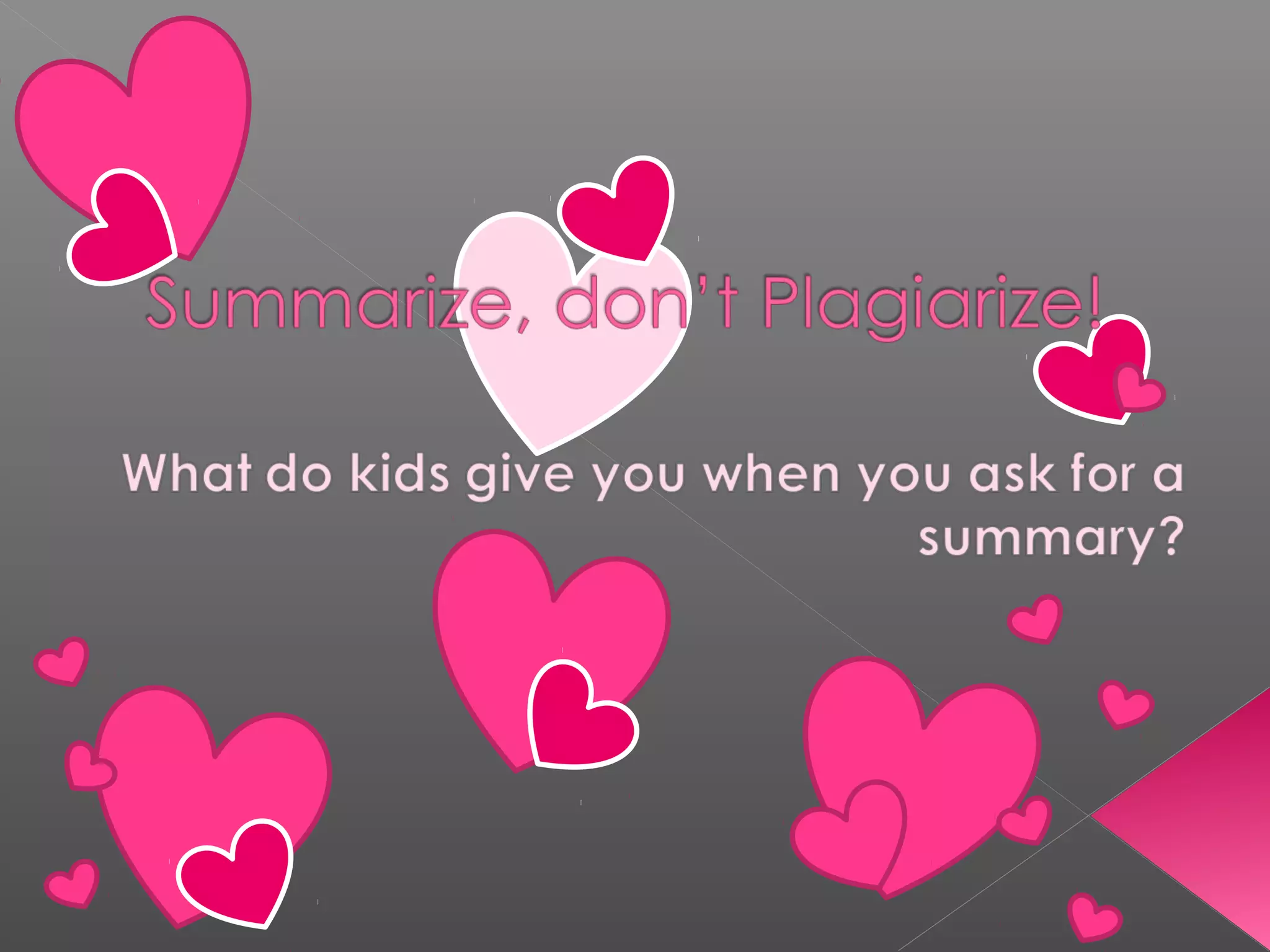 This document provides guidance and examples for teaching students how to summarize texts. It discusses the importance of summarizing in developing comprehension and different strategies students may use incorrectly when summarizing. The document then offers various strategies and templates teachers can use to help students learn how to properly summarize, including having them identify main ideas and key details, write headlines, use graphic organizers, reduce details across multiple drafts, and focus on conveying the overall meaning in fewer words. Emphasis is placed on modeling the skill repeatedly and giving students practice time to develop their summarizing abilities.