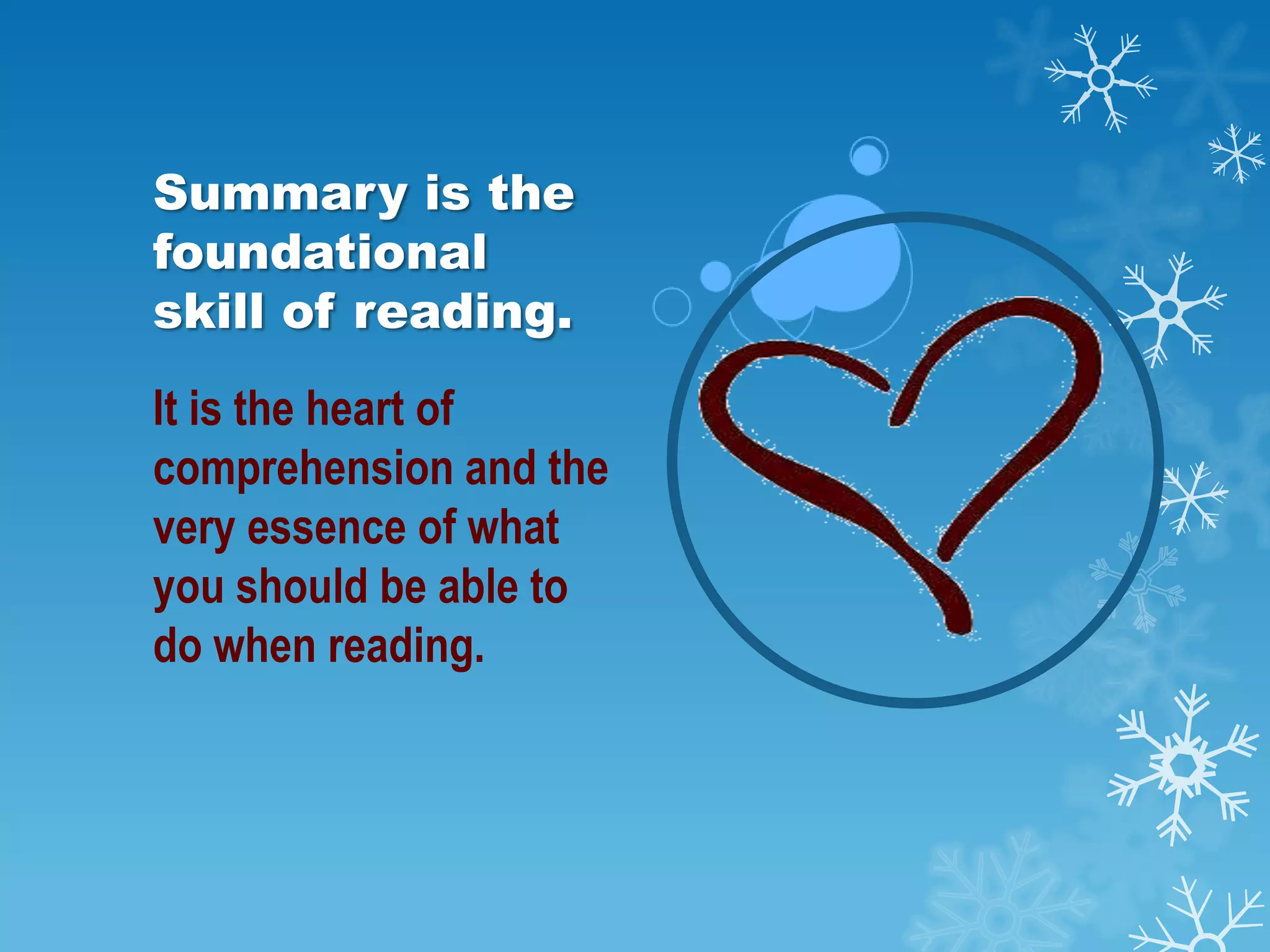 Summarization is a foundational reading skill that involves condensing a text into a shortened version that focuses on the essential main ideas and important supporting details. It differs from paraphrasing in that a summary is shorter than the original text, while paraphrasing restates ideas using different words. When summarizing, one should maintain the overall structure of the original piece and focus on the top main ideas, connecting them in a cohesive manner using transitions while employing formal academic language. The skill of summarization is a key aspect of reading comprehension.