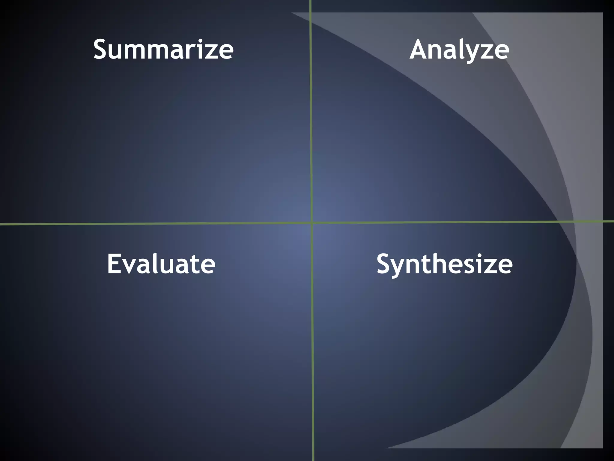 The document provides information and examples about summarizing, analyzing, evaluating, and synthesizing texts. It defines each term and provides guidance on how to identify when each skill is being used. Examples are also given to demonstrate applying each skill to a short poem. The document aims to teach readers how to distinguish between and apply different higher-order thinking skills.