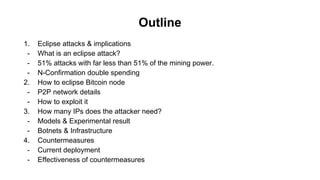 The document discusses eclipse attacks on Bitcoin's peer-to-peer network, where an attacker can isolate a victim node by controlling its connections and allowing the attacker to double-spend with less than 51% of the network's mining power; it analyzes how many IP addresses an attacker would need using botnets or infrastructure to eclipse a node, and proposes several countermeasures that Bitcoin has implemented or could implement to make eclipse attacks more difficult.