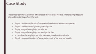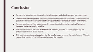 The document presents a comparative study of various software quality models, including McCall, Boehm, FURPS, Dromey, and ISO/IEC 9126, outlining their advantages and disadvantages. It proposes a formal comparison method based on mathematical evaluation to assess strengths and weaknesses and aid in creating standardized software quality metrics. The study also emphasizes the importance of defining clear evaluation criteria and the relationships between quality factors and software characteristics.