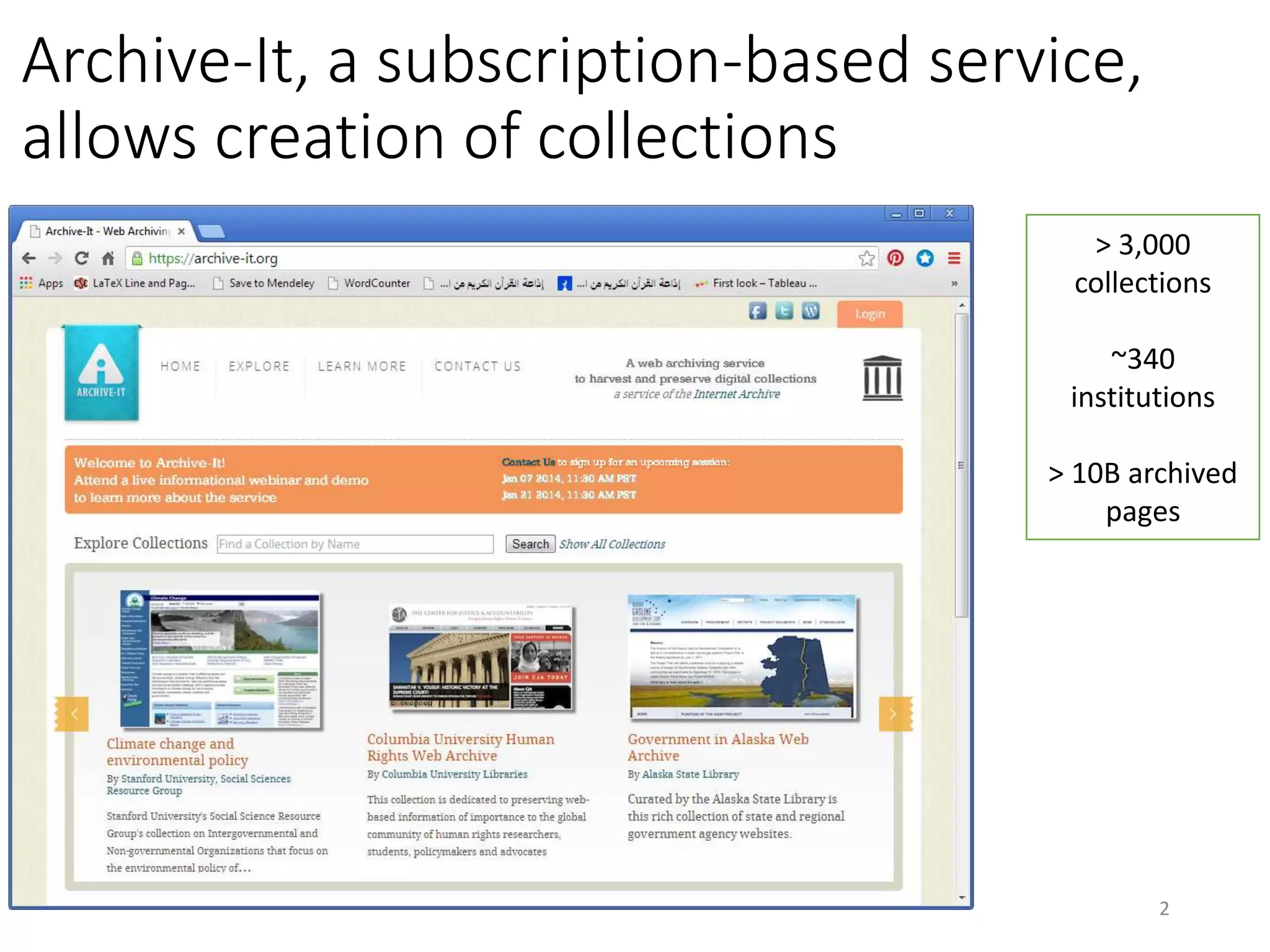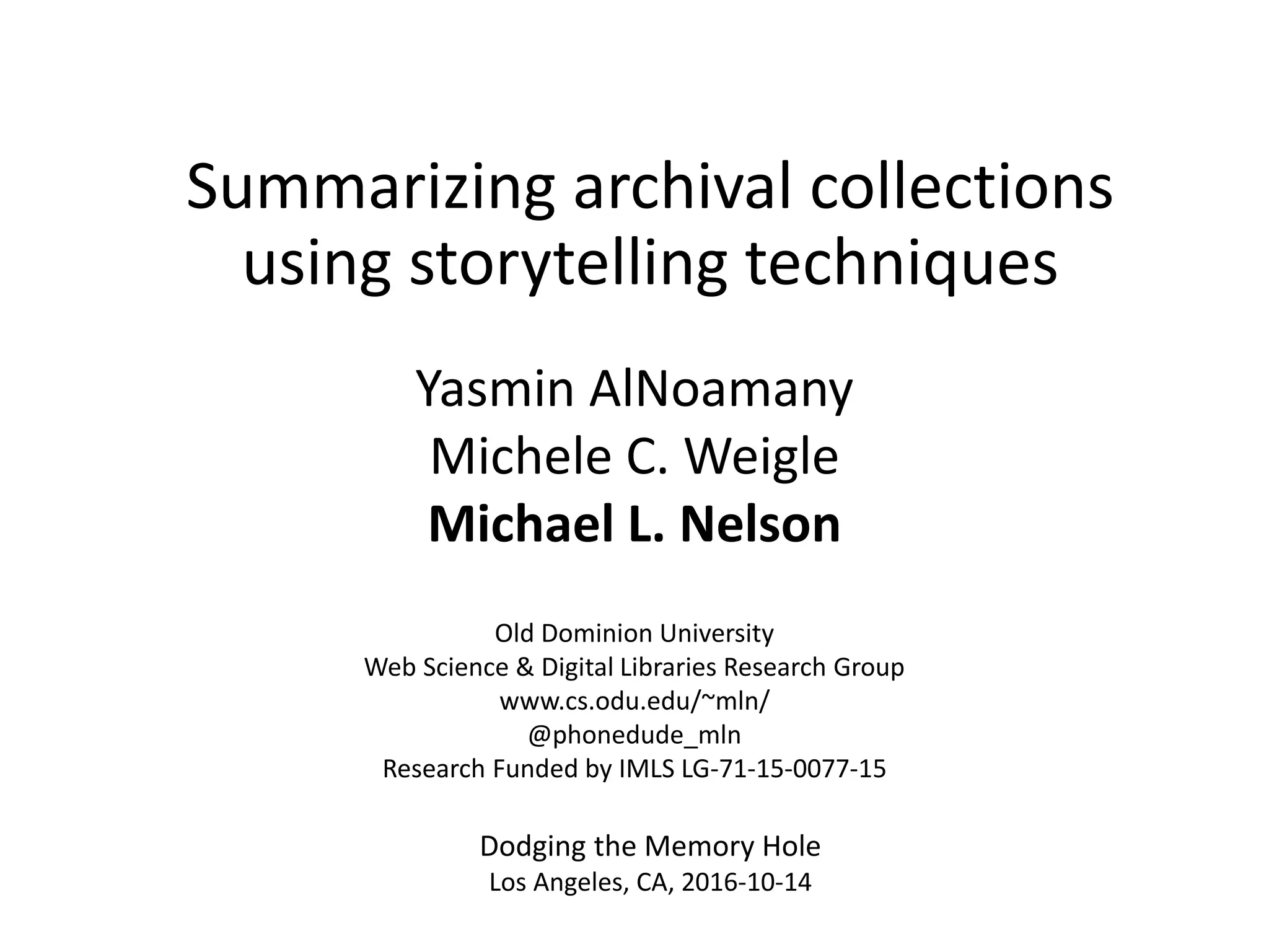 The document discusses techniques for summarizing archival collections using storytelling methods, particularly focusing on the Archive-It service and its collections related to the Egyptian Revolution. It explores the challenges of understanding and differentiating collections and presents a framework for dynamically selecting and visualizing important pages from archived content. The framework aims to enhance user engagement and archive utility by automating the generation of compelling narratives from historical data.