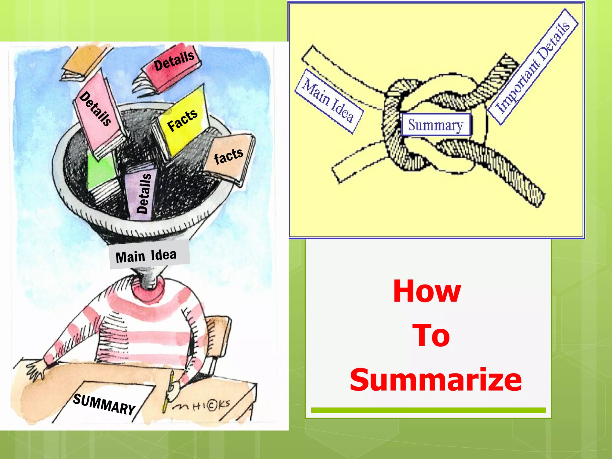 The document provides guidance on summarizing texts, including identifying the main topic or key details, pulling out important facts while removing repeated or unimportant details, categorizing and labeling facts, and writing a summary sentence that conveys the main idea in 3 sentences or less using the topic and a verb.