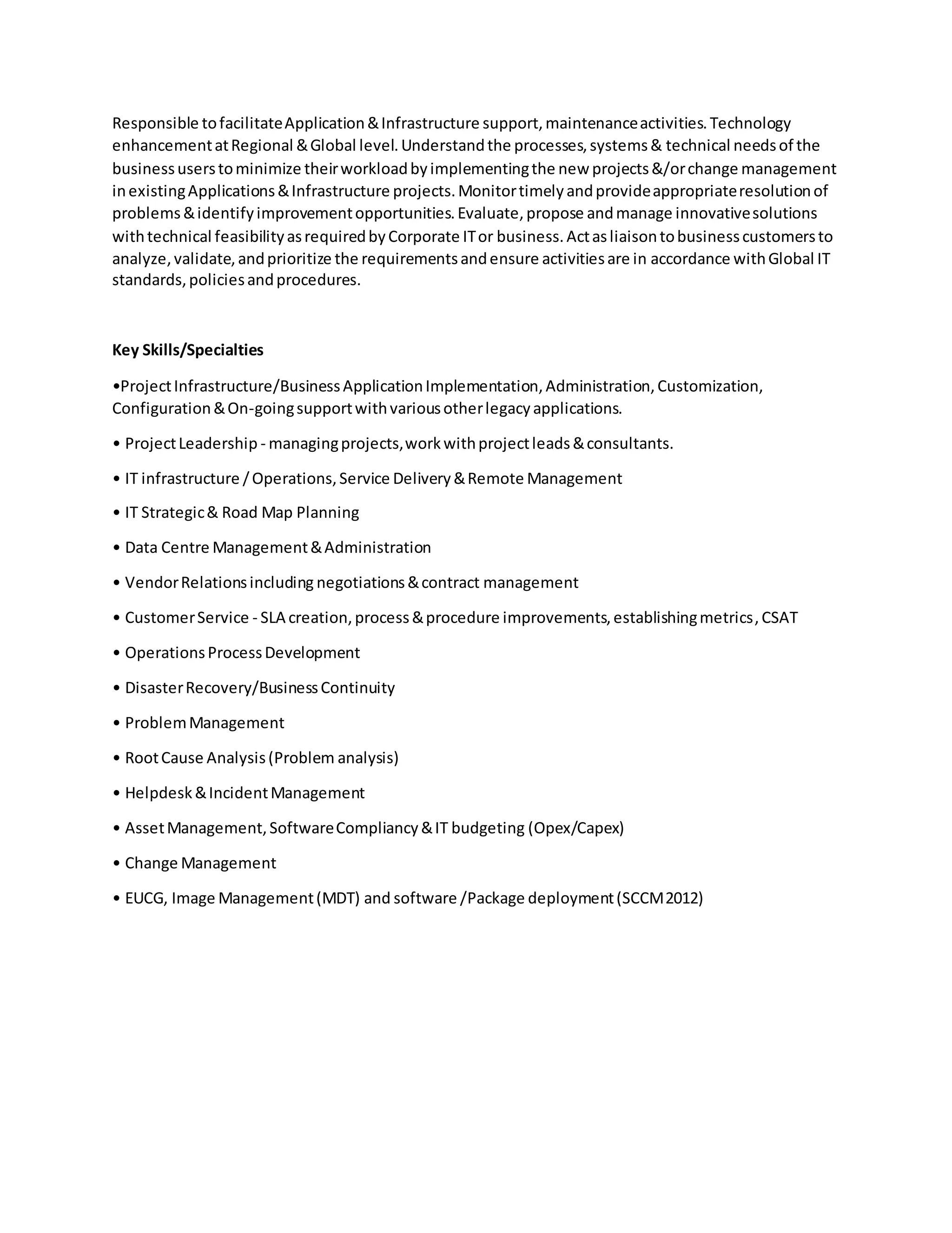 The document outlines the responsibilities of a role responsible for facilitating application and infrastructure support and maintenance activities at both the regional and global level. Key responsibilities include understanding business users' processes, systems, and technical needs to minimize their workload through new projects and changes to existing applications and infrastructure. The role also monitors for timely resolution of problems, identifies improvement opportunities, and evaluates and proposes innovative technical solutions as required. Additionally, the role acts as a liaison to business customers to analyze, validate, and prioritize requirements in accordance with global IT standards, policies, and procedures.