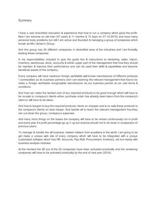 Usman leads a group of 20 diversified companies known as Usman's Group. With over 57 years of experience, he provides guidance to upper management on improving performance and utilizing skills to benefit the companies. He teaches management how to establish beneficial partnerships with well-known foreign manufacturers and how to import products at good landed costs to resell at profits. His goal is for all companies to remain profitable with increasing profits year over year. He plans to develop integrated websites and customized software for remote management of all business matters. So far 6 of the 20 companies have been activated with the rest planned for activation by the end of 2016.