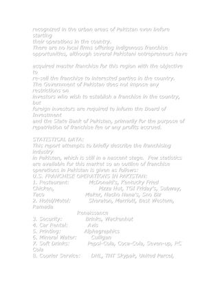 This document summarizes the franchising industry in Pakistan. It finds that franchising has grown significantly in recent years, especially in the food sector. U.S. franchises dominate the market due to their early entry and long term commitment. The best prospects for future growth are in education, courier services, retailing, and hotels. While regulations are minimal, foreign investors must notify authorities.