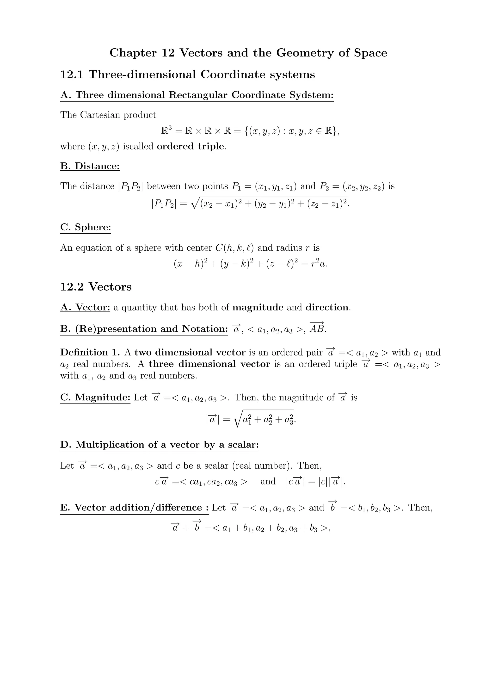 The document summarizes key concepts from a chapter on vectors and geometry in 3D space. [1] It introduces three-dimensional coordinate systems using ordered triples (x,y,z) and defines the distance formula between two points in 3D space. [2] It also defines concepts like the sphere equation and vectors, including their representation, magnitude, addition/subtraction, and dot and cross products. [3] It concludes by covering lines, planes, and their equations, as well as cylindrical coordinates.