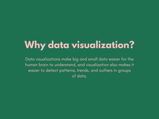 This document provides an overview of data visualization principles and best practices. It discusses why data visualization is useful for understanding large and small datasets by making patterns and trends easier to detect. It then outlines six principles for designing effective charts, including embracing scale, providing structure and clarity, and being honest. The document also categorizes different chart types such as line charts, bar charts, and scatterplots according to what types of data relationships they show, such as change over time, category comparisons, and distributions.