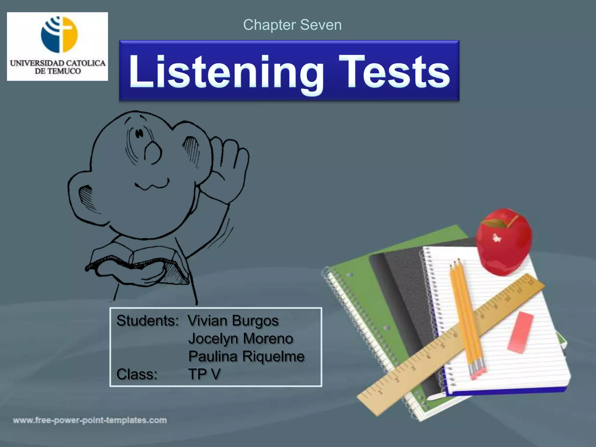 The document discusses different types of listening tests for evaluating English language skills: