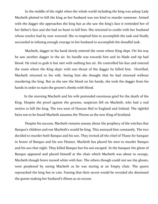 1) Macbeth, a general in the King Duncan's army, is told a prophecy by three witches that he will become King of Scotland.