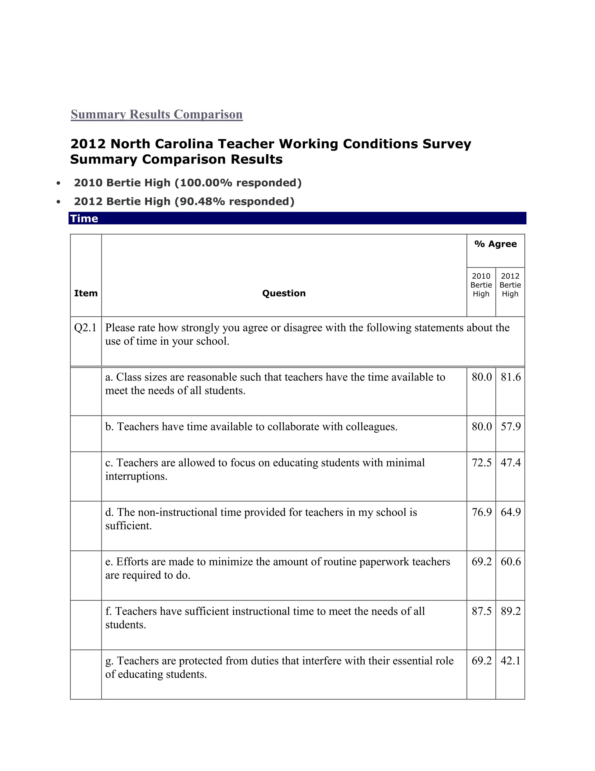 The document compares survey results from 2010 and 2012 from teachers at Bertie High School on various aspects of working conditions. Some key findings from the comparison include: