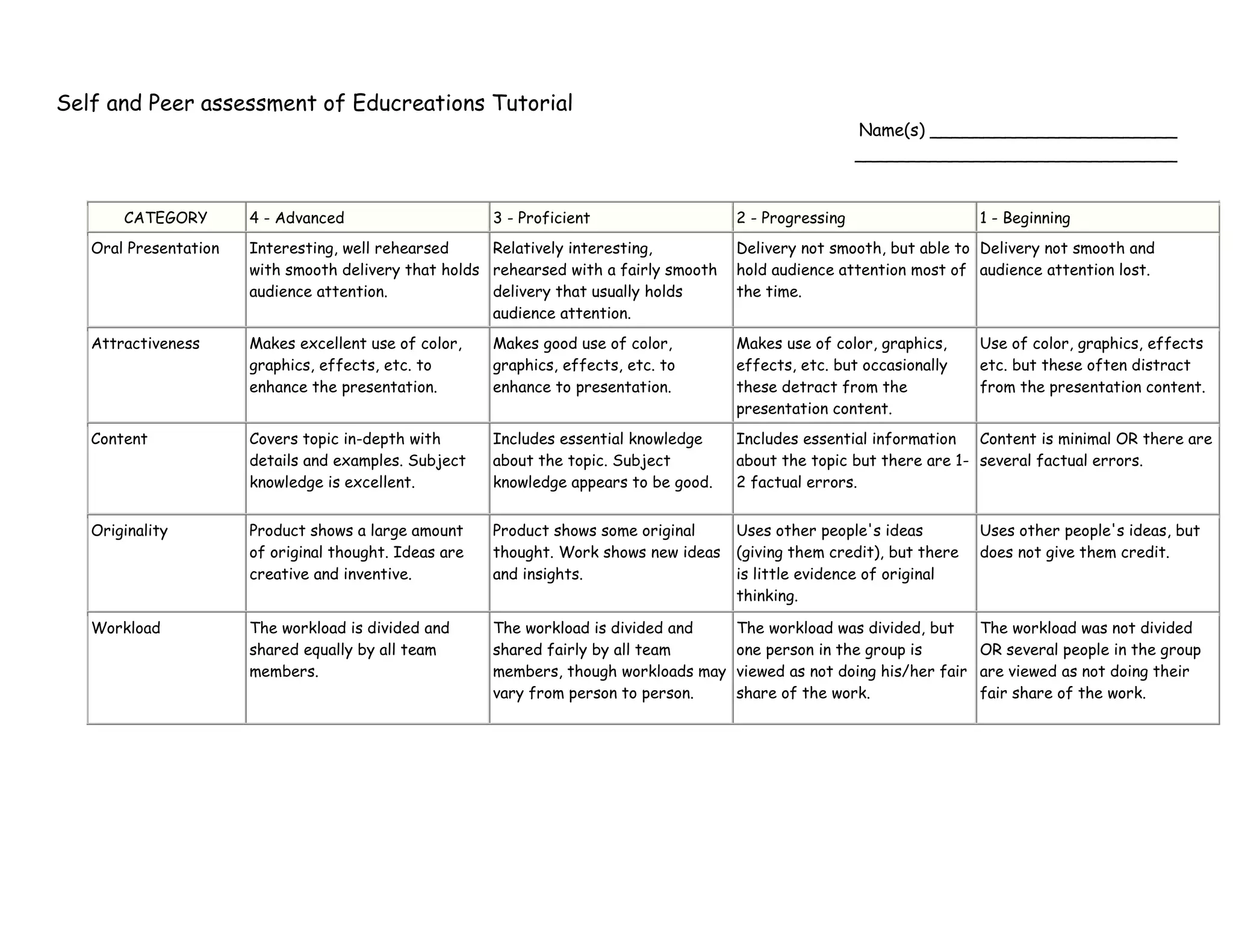The document provides a rubric for assessing final presentations and self/peer assessments for an Educreations mini garden lesson. It includes categories such as images, voice, narrative, content, and workload distribution. Each category is scored on a scale from 1-4, with 4 being advanced or exemplary, 3 being proficient, 2 being progressing, and 1 being beginning. The rubric provides descriptors of what constitutes each score for each category to guide assessment of the presentations and self/peer reviews.