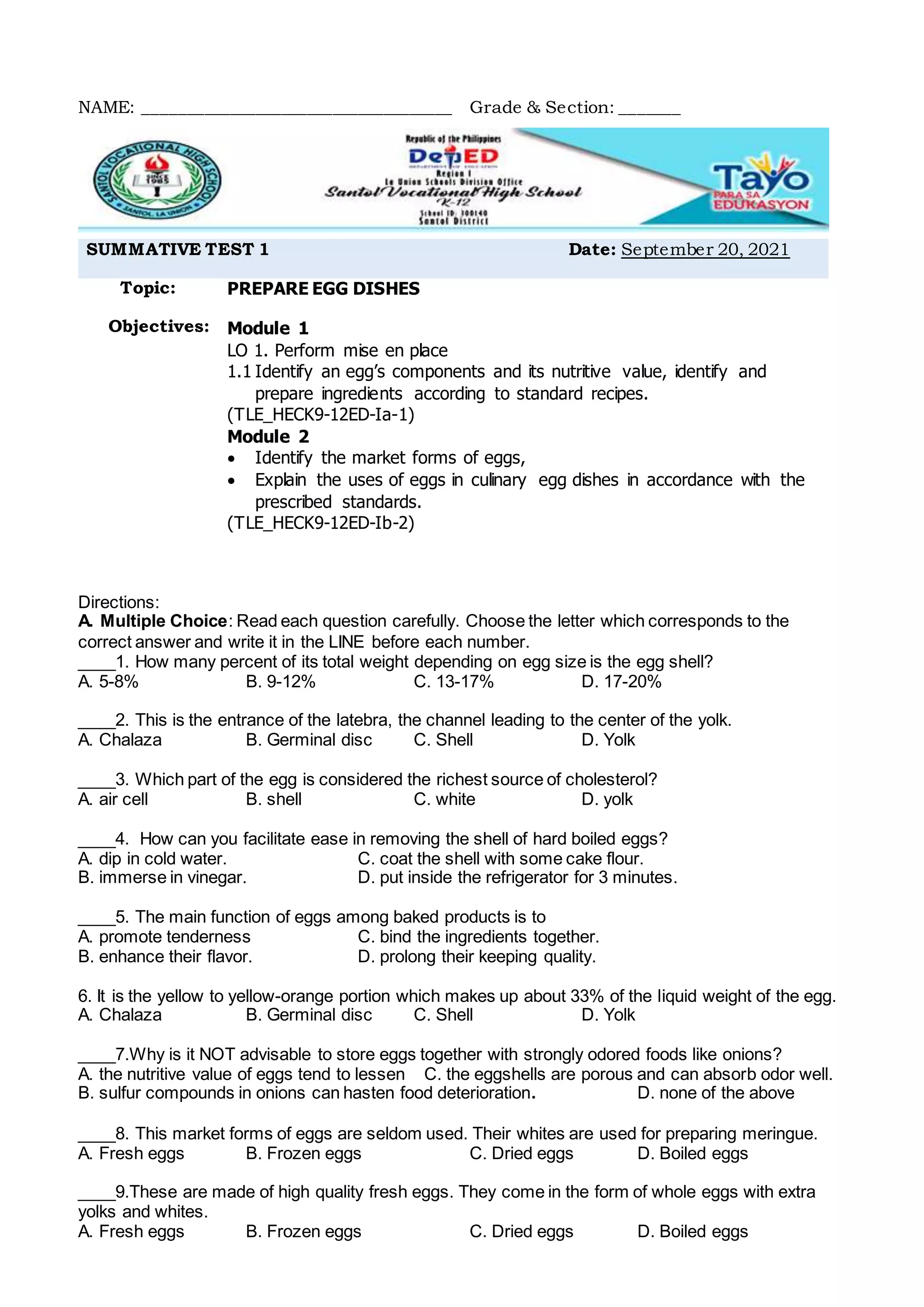 This document contains a summative test with 25 multiple choice questions about eggs. The test covers identifying the parts and nutritional value of eggs, different market forms of eggs, uses of eggs in cooking, and methods for determining egg quality and freshness such as candling and the water test. It also asks students to identify egg functions in baking like binding ingredients, and processes like aeration. The test is intended to assess students' learning on preparing egg dishes in accordance with prescribed standards and performing mise en place by identifying egg components and preparing ingredients for recipes.