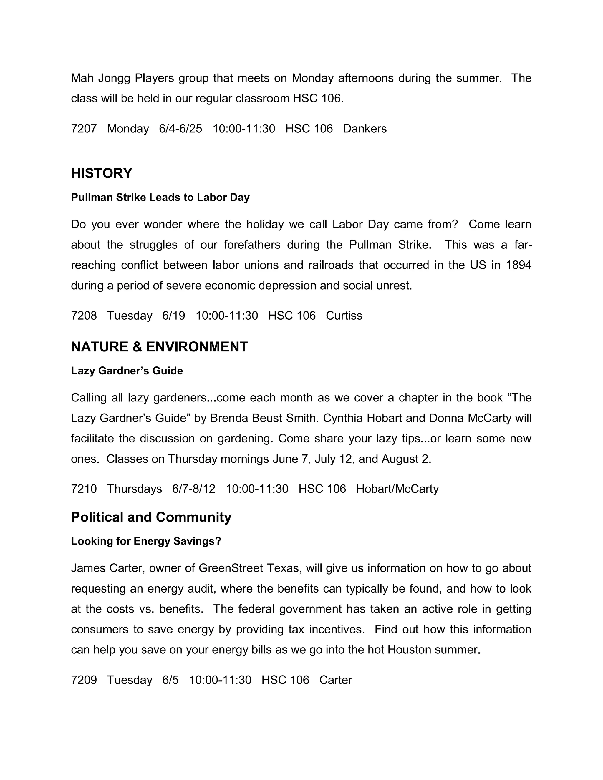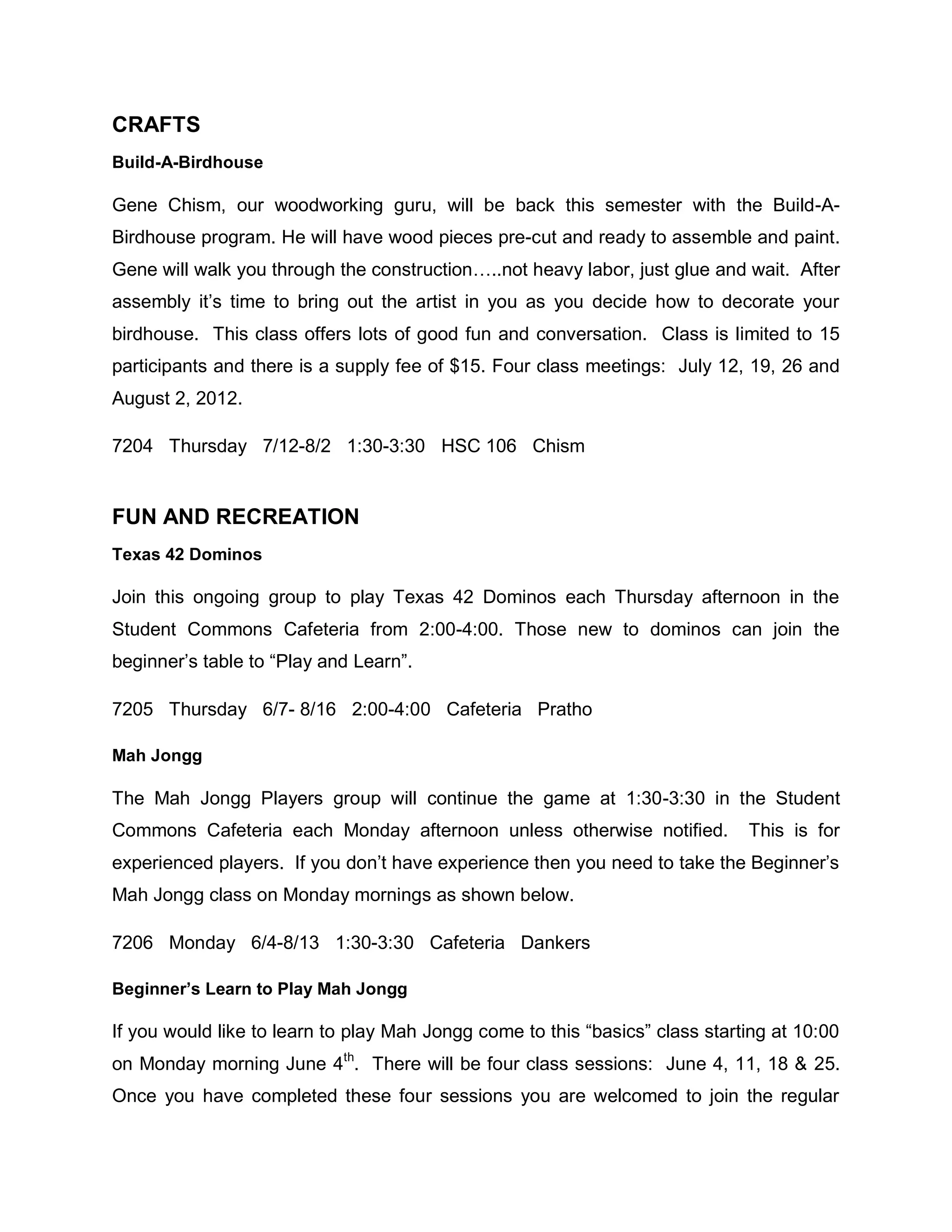 Gene Chism will teach a four-week Build-A-Birdhouse woodworking class where participants will assemble and decorate birdhouses. The class is limited to 15 people and has a $15 supply fee. It will meet on July 12, 19, 26 and August 2 from 1:30-3:30pm in room HSC 106. Several ongoing recreation activities are also listed, including dominos on Thursdays and mah jongg on Mondays. A range of courses on topics like history, gardening, energy savings and current issues are provided on Tuesday mornings between June and August.